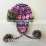 High Quality custom diamond jacquard knitted pattern winter trapper hat with earflap and faux fur pom