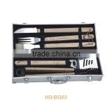 factory price of portable BBQ barbeque set with wooden handle of fork spatula tong condiment brush knife in aluminium case