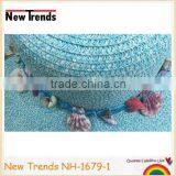 Light blue and white colors summer floopy woevn paper straw hat with shells hatband