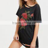 Floral Ripped Dress Women Black Sexy Cut Out Neck Rose Embroidery Summer Tee Dresses 2017 New Casual Mini Shift Dress