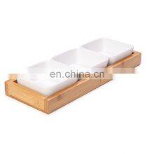 Ceramics Porcelain Snack Serving Bowls Set of 3 Bamboo Condiments Tray Bowl Holder for Sauce, Snacks, Fruits, and Cheese