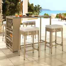 5 Piece Beige Rattan Wicker Bar Set, Patio Dining Furniture, Wine Glass Holder and 4 Bar Stools